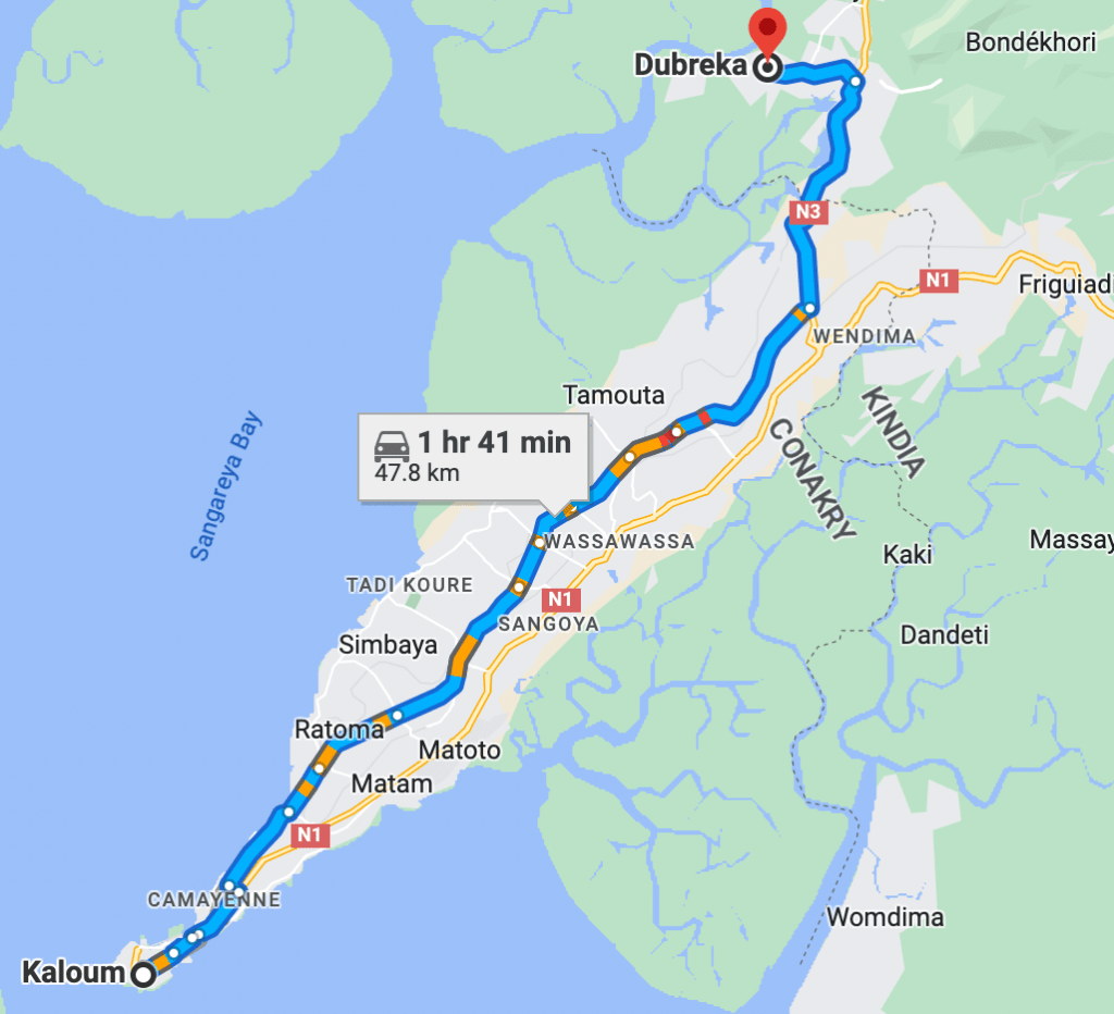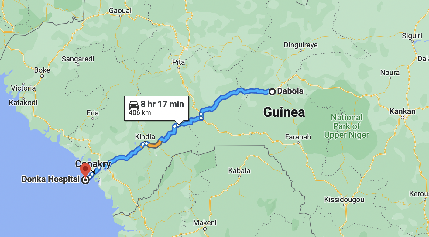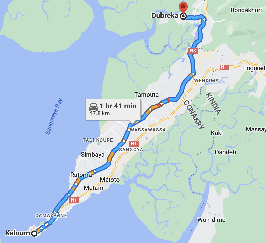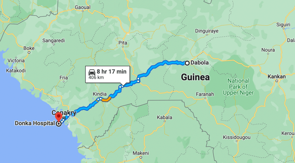 At the end of my third week, they arranged for me to meet at driver who would help shuttle me from the furthest corner of Conakry. I took a cab at 5:30 AM to meet the driver half an hour away because otherwise the two-hour commute would double in the morning traffic (Below, I have included a map of this journey, although Google typically doesn’t account for road conditions and tends to under-estimate travel times here; as a point of comparison, further below, I have also included a trip from Dabola, in the middle of the country, to Donka, the capitol’s biggest hospital, but note that Dabola has a “national route” (i.e., road) to access the capitol and this excursion could take far longer coming from elsewhere in the country). The adventure included the hiccup of losing cellphone signal at the rendezvous point (see above) and waiting nearly an hour in the dark with my backpack in a strange part of the city until the driver came looking for me (there is never a dull moment here). I dozed on the drive and when I first opened my eyes, I was greeted with the welcome sight of greenery: due to the difficulty of getting outside the capitol, scarcely had I ventured from my corner of the concrete jungle and scarcely had I seen grass, trees, or shrubbery.